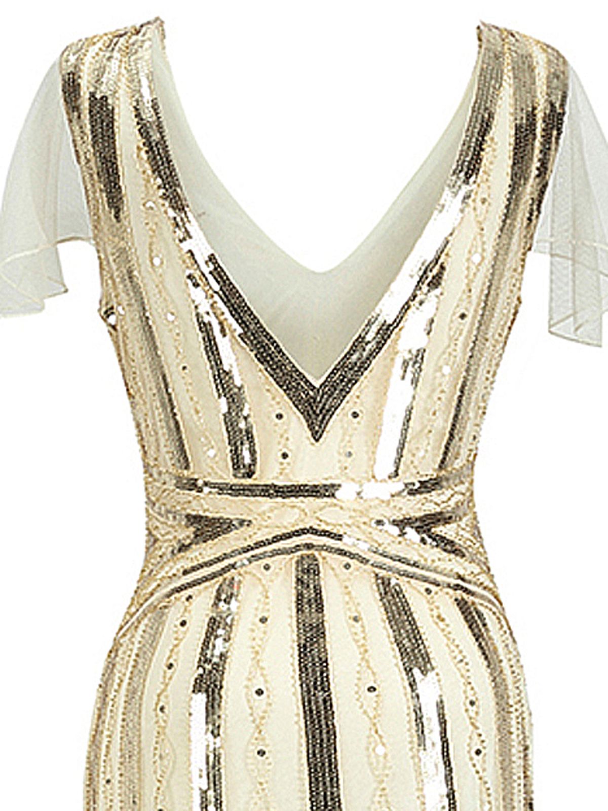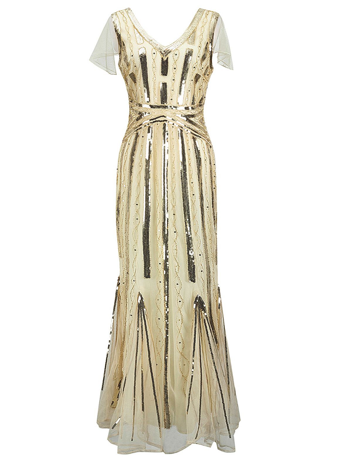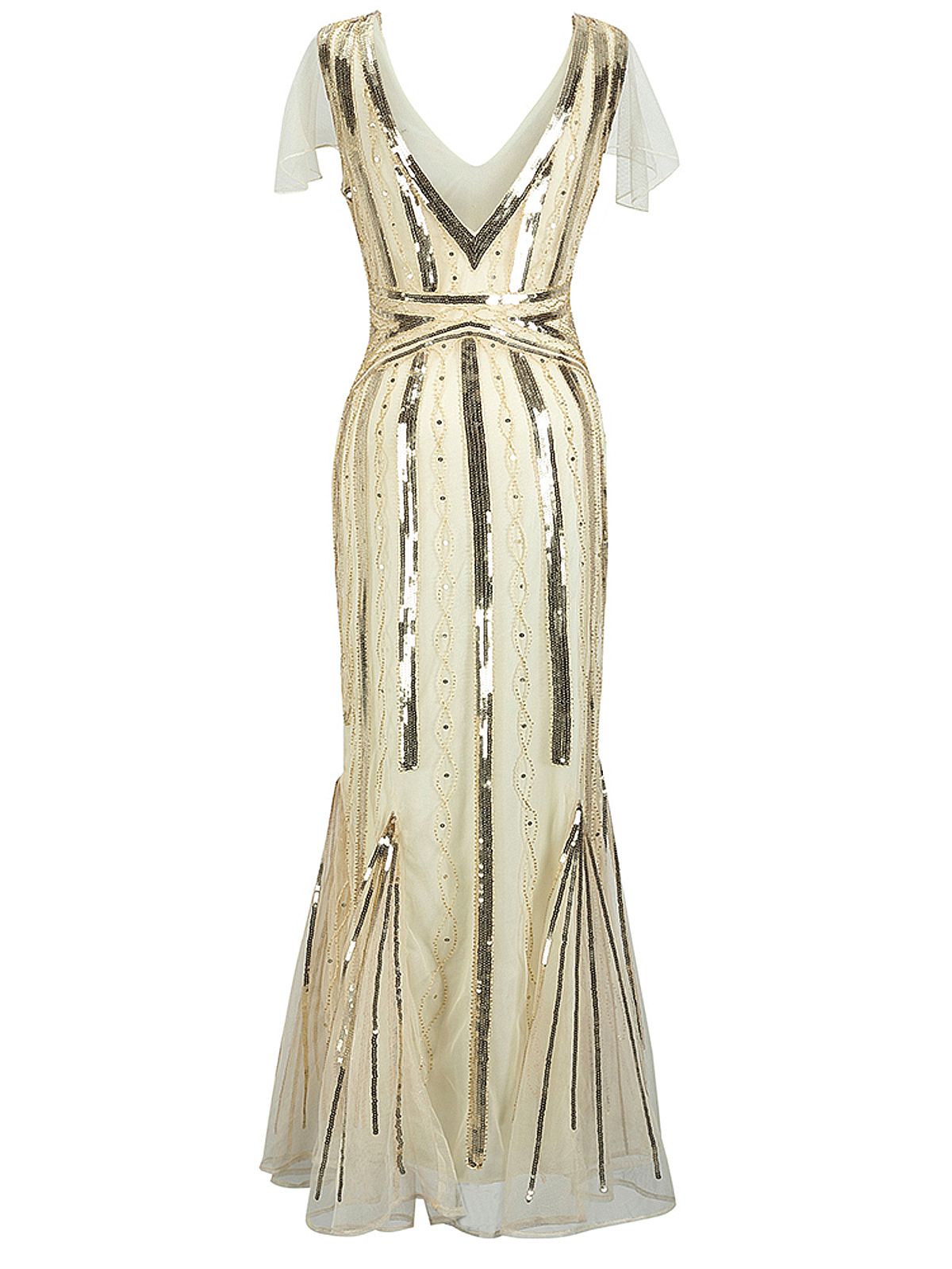 Show off some opulence, darling! Steal some hearts at your next cocktail party with this Gatsby dress, a sultry cap sleeve form with a modest v-neck and a comfortable knit lining. A breathtaking vintage-inspired dress from Retro Stage.