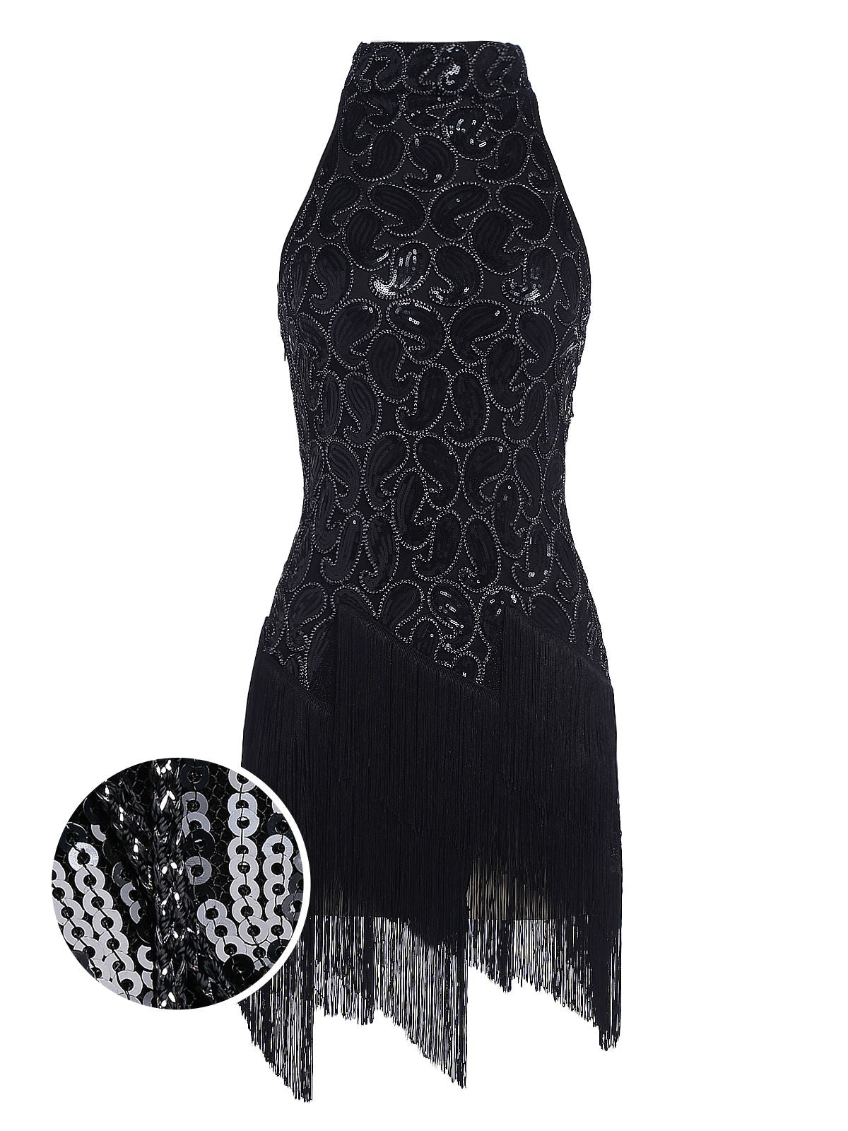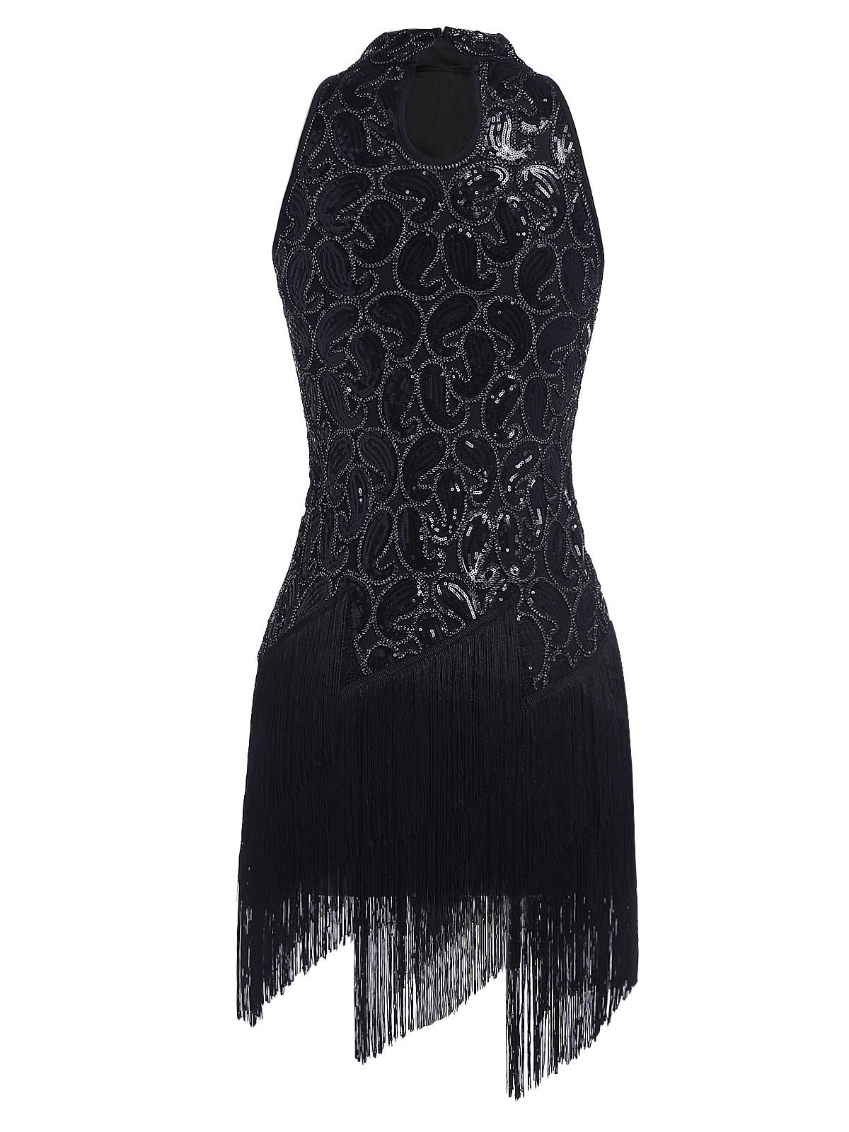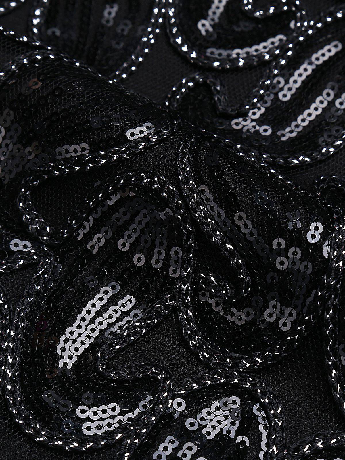 Your ticket to divinity, darlings! Intricately deco beaded silver sequins boast iridescent sequins and small beads wrought in flourishing deco swirls and spirals, while black knit lining creates a radiant effect. With a bit of royalty and aristocratic detail, this flapper dress is fresh from Retro Stage in stunning 1920s design.