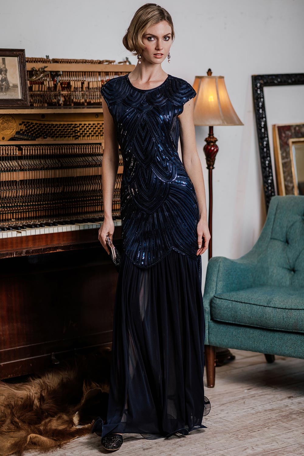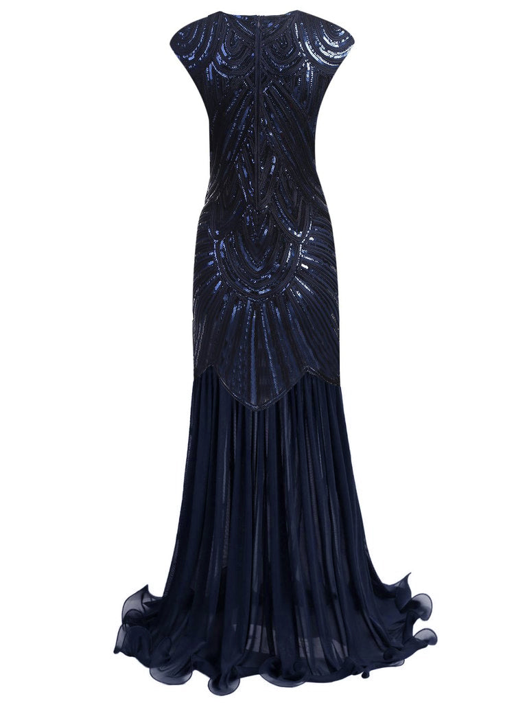 Sparkling, stylish and spectacular! This classy cocktail dress exudes the majesty of the 1920s with a chic navy blue and pink mesh over knit lining, embellished with twinkling black and silver sequins and beading. This Flapper Dress from Retro Stage is cast in an unstoppable 1920s style cocktail dress that demands attention.