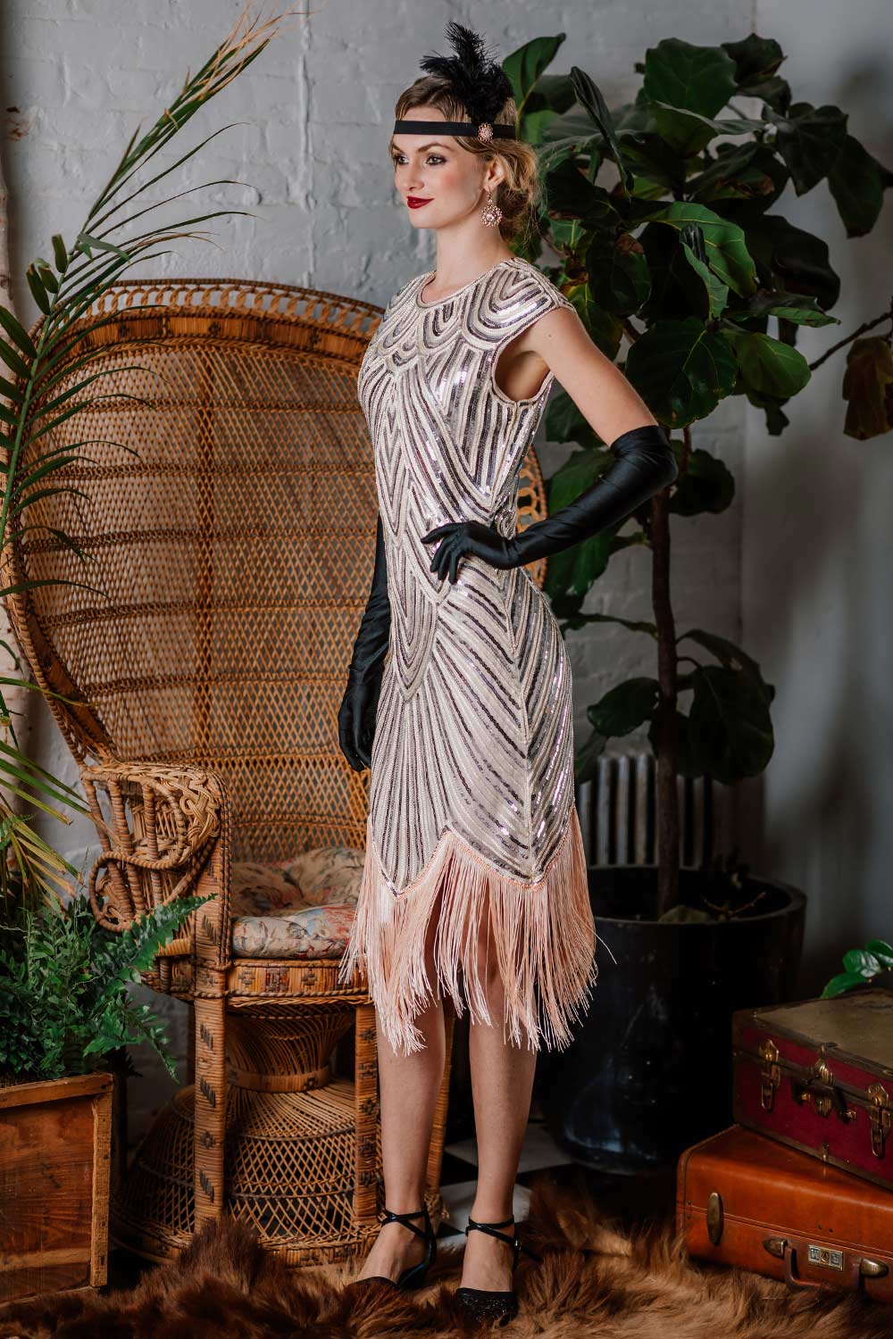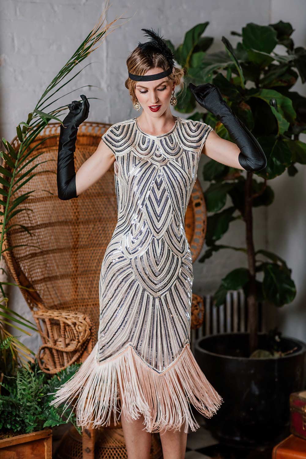 Show off some opulence, darling! This stunning 1920s style frock from Retro Stage is a gorgeous deco affair in fabulous flapper design. Thanks to swirling sequin patterns, it sparkles and shines all night long. Plus, the sultry boat neck and cap sleeves make it even more alluring. Outfitted with a back zipper to flatter your feminine form, outshine the competition!