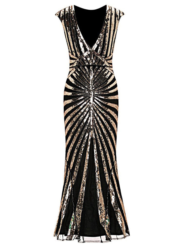 Your ticket to divinity, darlings! It’s all about the details with this stunning 1920s sequin Gatsby dress from Retro Stage. Thanks to swirling sequin patterns, it sparkles and shines all night long. Plus, the sultry boat neckline and little cute cape sleeve make it even more alluring. The glitzy Art Deco vibes and sultry silhouette will have you shimmying and swaying with confidence.