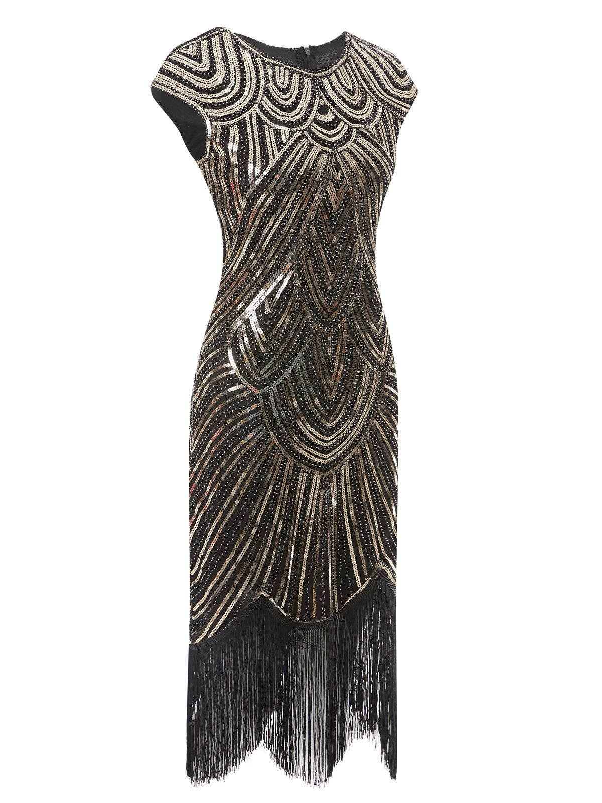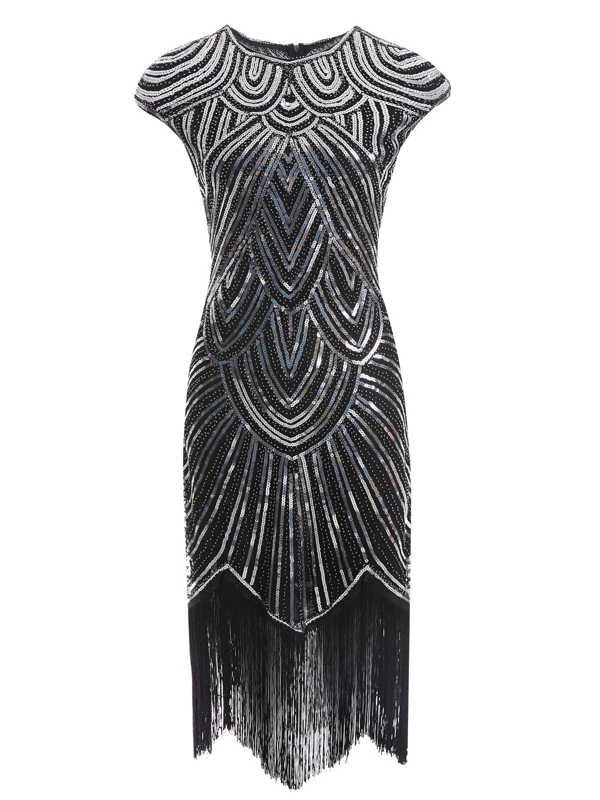 Show off some opulence, darling! This stunning 1920s-style frock from Retro Stage is a gorgeous deco affair in fabulous flapper design. Thanks to swirling sequin patterns, it sparkles and shines all night long. Plus, the sultry boat neck and cap sleeves make it even more alluring. Outfitted with a back zipper to flatter your feminine form, outshine the competition!