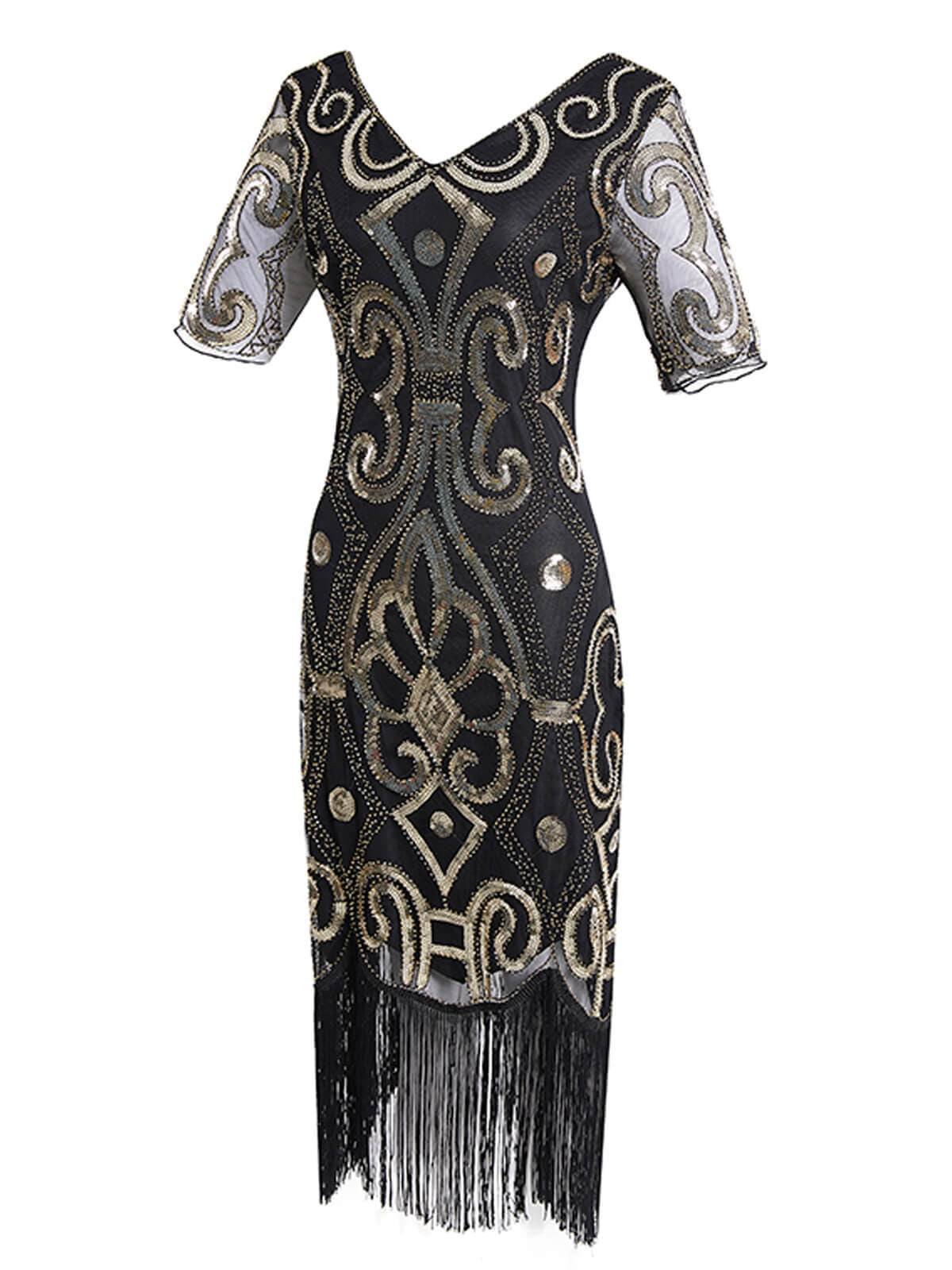 Shimmy some sparkle into your life, dear! Shimmer into an eye-catching vintage style with this iconic flapper dress from Retro Stage with crisp beading for a striking silhouette. Gleaming from every angle, the fitted form drops to a straight hemline that sways with a long black fringe.