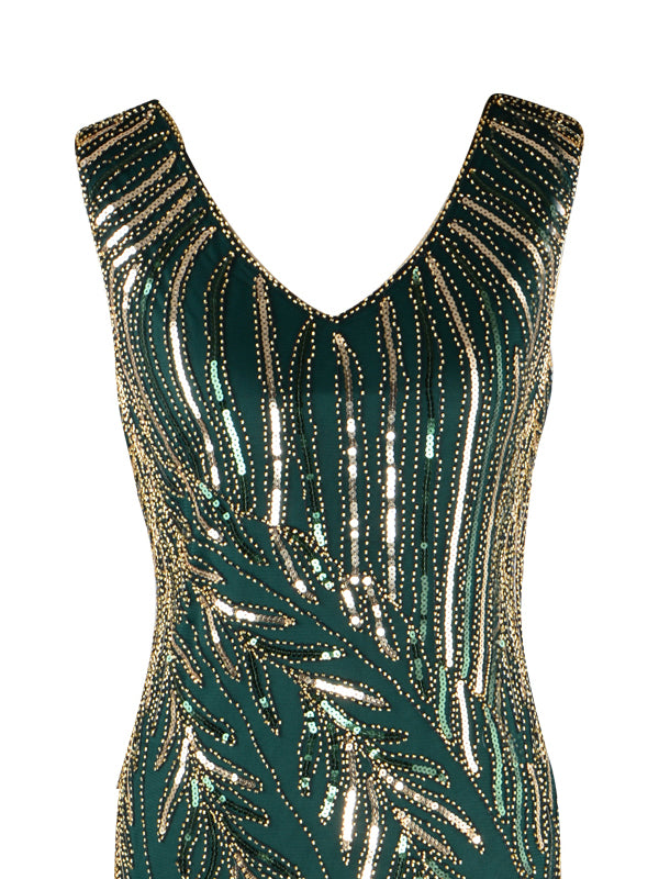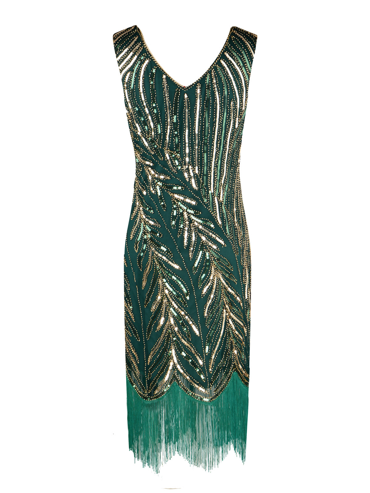 Sparkling, stylish and spectacular! The modest v-neckline is framed by sweet sleeveless that shimmy with dazzling fringe. This striking flapper dress from Retro Stage shimmers with sequins throughout a vintage flapper silhouette.